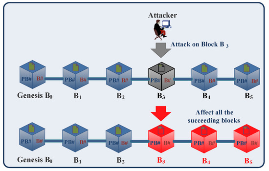 The blockchain is immutable [78], i.e., the previously stored data cannot be changed. All of the valid transactions are immutably stored in blocks of blockchain. In blockchain, each block is connected with the previous block using its hash value generated by a cryptographic hash function. If an attacker tries to alter any previous block record, it will affect all of the succeeding blocks of the blockchain, and the attack can be easily detectable, as shown in Figure 3. For example, in Figure 3, an attacker tries to change the records of block B3, and because of this feature, the changes in block B3 affect all of the succeeding blocks, i.e., B4 and B5 of the blockchain. Immutability ensures the security of blockchain transactions and makes data less vulnerable to attacks.