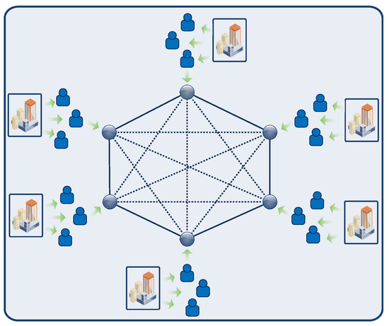 A consortium blockchain is a special type of private blockchain where a selected number of participants from multiple organizations can participate in the consensus process. Figure 7 depicts the structure of a consortium blockchain. A consortium blockchain helps to maintain transparency between the involved organizations. Similar to a private blockchain, there are no transaction processing fees; hence, it has a lower cost. A consortium blockchain is partially decentralized or tamper-proof. An example of a consortium blockchain is Hyperledger.