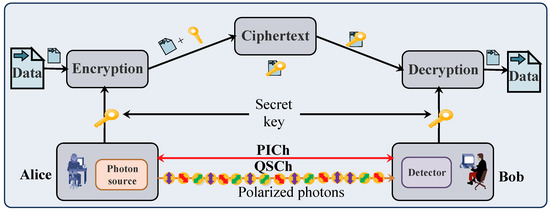 This section provides an overview of QKD technology for secure communication. QKD relies on the fundamental principles of quantum mechanics, namely the Heisenberg’s uncertainty principle and the quantum no-cloning theorem [48,55,56,80]. QKD establishes a secure connection between the end-users by generating and distributing secret keys over an insecure channel. A QKD protocol generates a secret key between the end-users and ensures security against eavesdropping. Several QKD protocols are designed for secret key generation, discussed in [54,81,82,83,84,85,86]. The most widely used QKD protocol is the BB84 protocol proposed in 1984 [48]. Additionally, for secret key generation and distribution, QKD requires two channels, namely QSCh and a public interaction channel (PICh), as shown in Figure 8 [47]. QSCh sends quantum bits (qubits), i.e., encoded polarization photons, between the end-users. PICh is used to transmit the measuring basis of qubits and verify the secret keys using post-processing methods.