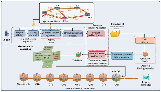 This section describes the quantum-secured blockchain technology along with its underlying process. Blockchain technology is strong enough to provide security within the blockchain network between the nodes by leveraging asymmetric cryptography and hashing algorithms. Asymmetric cryptography generates a pair of keys to provide security between the nodes and authenticate transactions by generating a digital signature. The most widely used digital signature schemes are Rivest, Shamir, Adleman (RSA) [92], or elliptic curve cryptography [46]. Hashing algorithms also play a crucial role in providing security by hashing the transaction data and linking blocks of a blockchain by generating block hash values. However, the security of both asymmetric cryptography and hash algorithms relies on the computational complexity of certain mathematical functions that quantum computers can easily attack shortly [45,93]. Hence, blockchain will release all of its security features and become insecure. If quantum attack-aware schemes are not designed to enhance blockchain security, then the existing and future blockchain networks will become vulnerable and put blockchain at risk.