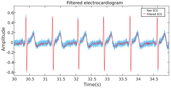 Noise–canceled electrocardiogram (ECG) signal using an FIR filter. Note that the noisy components in the raw ECG signal (in blue color) are attenuated to derive the actual signal (in red color).