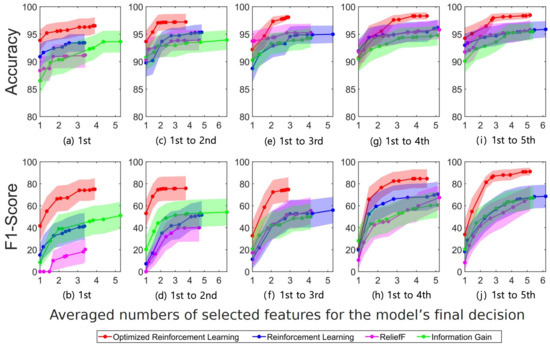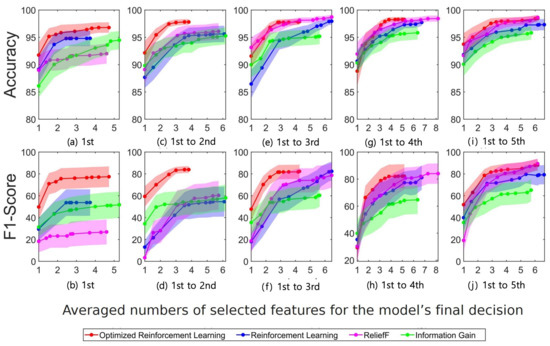 Figure 5 and Figure 6 depict the classification results including the performance indices, accuracy, and F1-scores, using the SVM and RF, respectively, where the indices were the averages of 10 simulation repetitions for the test dataset. In the figures, four different costly feature selection algorithms are compared: DQN with BOHB optimization (optimized RL), DQN without any optimization process (RL), and the ReliefF and IG feature selection algorithms. For the optimized DQN classifier, the model with the highest validation accuracy was chosen, and the feature selection was conducted. The x-axis of the subplots in Figure 5 and Figure 6 displays the average numbers of the selected features for the model’s final decision, while the y-axis displays the accuracy and F1-score performance indices. In Figure 5, the use of the SVM classifier of the optimized DQN algorithm outperformed the other feature selection algorithms with accuracies of 96.5%, 97.2%, 98.1%, 98.3%, and 98.5%, and F1-scores of 75%, 75.9%, 74.8%, 84.6%, and 91.1%. The numbers of the selected costly features were approximately equal to 3.9, 3.7, 2.9, 4.5, and 5.2.