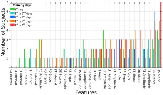 The extracted features from a single-lead ECG signal have been proven to provide reliable authentication results [34,35,36]. It has also been reported that the long-term stability of the features is guaranteed for several days or even years [34,37,38]. This study also explored the long-term stability of the ECG features for a personal authentication system using ECG signals that were recorded for six days. Additionally, this study identified the ideal ECG features that were considered the most significant for the classification of a user among others. It was found that the biometric authentication task that uses a high number of significant features, also known as “costly features”, performed better than the one that used all the features extracted from the biometric signals without taking into consideration their significance in relation to the task [39,40,41,42].