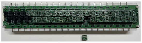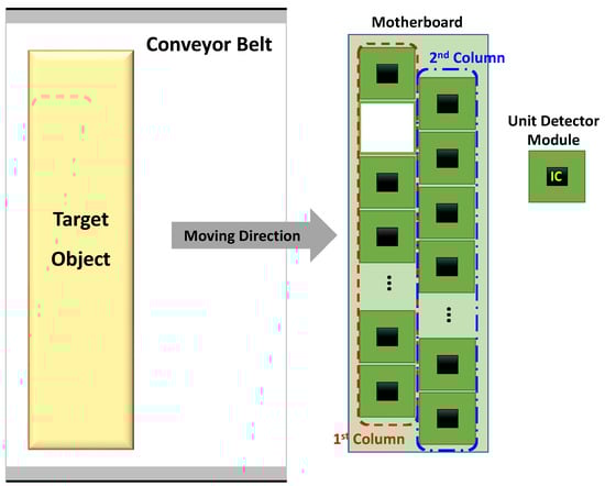 Each detector unit module was connected to the motherboard, which is 240 mm × 30 mm, as shown in Figure 11, to form the proposed 16 × 2 detector array. A low-quality unit module, which has low detection characteristics and malfunctions, can be replaced in the proposed array, because the interface is implemented with the same pin array sockets used in the adapter board. All bias voltages supplied to the unit modules are equally applied, and the effect of the voltage drop of the interconnection lines is minimized by a parallel connection. The output of the unit module in the proposed array is individually configured for connection to the data acquisition board with multi-channel inputs. When the assumptions of the conveyor belt speed and incident signal on each column of the detector array indicated in Section 2 are valid, the proposed array structure can increase the image resolution by increasing the number of columns. Increasing the number of columns can increase the complexity of implementing the system, as both a faster-moving speed of the conveyor belt and a higher sampling rate for acquiring the data are required. This assumption can become invalid, as the differences in the sampling times between the unit detectors increase. The columns used in this study are set to two lines to demonstrate the effectiveness of the proposed array.