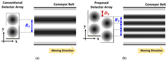 The proposed detector array increases the spatial resolution by using a configuration in which two or more detector columns are offset from one another. Assuming that the incident signals on adjacent detectors are similar owing to the rapid movement of the conveyor belt, the operating principle of the proposed method is based on the spatial resolution of the image obtained from the detector sub-array in the first column, which can be subdivided into the image obtained from the detector sub-array in the second column. Figure 2 presents the configuration of the proposed detector array. The detector unit pixels are composed of one detector IC individually mounted on a miniaturized board. The entire array structure is formed by attaching the unit pixels to at least two motherboard columns. To explain the spatial resolution improvement by the proposed array, it is assumed that the signal detected in the unit pixel has a Gaussian distribution with the center of the detector IC, which is described by the contrast of the circle shown in Figure 3, owing to the gain and beam width of the integrated antenna. Based on this assumption, a darker contrast area in Figure 3 indicates a more dominant effect on the detector output. As shown in Figure 3, the traveling direction of the conveyor belt is assumed to be along the x-axis, and the dimension for reducing the spatial resolution is along the y-axis. As shown in Figure 3a, the spatial resolution of the conventional array configuration, which places the detector unit pixel in a line, can be determined by the coverage of the unit pixel owing to the large gap between the pixels. The resolution limitation of the conventional configuration is caused by the unit pixel size, which is larger than the pixel coverage. Integrating several detectors on a single chip is a common method for overcoming this resolution limitation. In the proposed array shown in Figure 3b, the spatial resolution can be increased by using the second column, which is located between the pixels in the first column. This is based on the fact that incident signals at the same position perpendicular to the traveling direction of the conveyor belt are similarly detected by the pixels in the first and second columns.