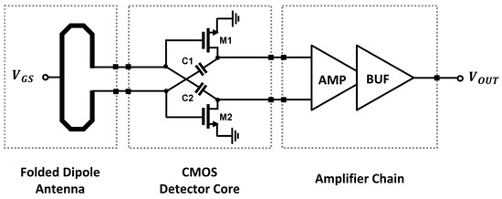 A CMOS detector IC is designed by using a detector core with a concurrent mode topology to increase the voltage responsivity (RV) to the incident signal [26]. The detector unit pixel consists of a folded dipole on-chip antenna, a preamplifier combining the DC outputs from the differential detector core transistors, and a unit-gain voltage buffer, as shown in Figure 4 [27,28].