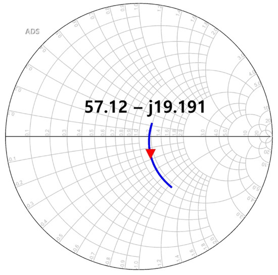 The concurrent-mode topology can obtain the maximum RV by the in-phase transmission of the differential input signals transmitted to the output drain node of the detector core transistor [26]. The differential incident signals are simultaneously input to the gate and drain nodes of the single detector core transistor and are individually generated to DC outputs at the drain node. An in-phase signal combination for increasing the detection output can be generated by implementing a phase shift of 180° by using a cross-coupled line and an additional capacitor. In the proposed detector core, the in-phase transmission was achieved using a cross-coupled line with a length of 18.6 µm and an additional capacitance of 58.5 fF, as shown in Figure 6. The phase from the positive input port to the output of the detector core transistor shown in Figure 6a and that from the negative port to the same output shown in Figure 6b demonstrated a difference of 180° by using the EM simulation. Impedance matching between the antenna and detector core was obtained using a transistor that was 1.2 µm × 65 nm (gate width × gate length), and the length of the transmission line was 90.6 µm, connecting the antenna and the detector core, as shown in Figure 7.
