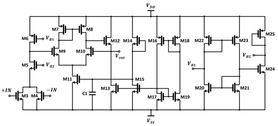 Figure 8 presents a schematic of the differential to the single-ended amplifier chain, consisting of a preamplifier and voltage buffer with bias circuitry. The DC voltage output from the differential detector core is applied to transistors M3 and M4, which are low threshold voltage devices and converted into a current signal passing through M5 and M6. The leakage signals in the sub-terahertz band are canceled at the M3 and M4 drain nodes and are not delivered to the output of the preamplifier [27]. The bias voltages VB1 and VB2 of the preamplifier were designed to be 0.65 V and 0.4 V, respectively, to have the maximum voltage responsivity at the output by bias circuit-implemented diode-connected transistors and current mirrors. A voltage buffer configured with a source follower provides feedback to increase both the RV and stability [26]. The bias circuits, consisting of the diode connection and current mirrors, are implemented with transistors M14 to M18 for a robust design for process variation.