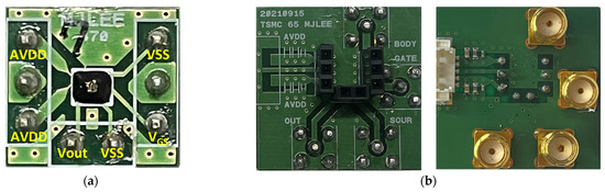 An integrated antenna, differential detector cores, and an amplifier chain were fabricated into a single chip detector using the 65-nm 1-poly 9-metal CMOS process, as shown in Figure 9. Considering the free space that does not affect the antenna radiation characteristics, the chip area was implemented on 500 × 450 µm2, including the wire-bonding pads. The DC bias pads for supplying the ground and the gate voltage of the detector core are located at the upper part of the fabricated IC, as shown in Figure 9, and the output signal and other bias pads of the detector IC are located at the lower part for a simple interface of the detector array. As shown in Figure 10a, the detector unit module using the fabricated IC was implemented on a PCB that was 1.08 cm × 1 cm (width × length). All the pads shown in Figure 9 were connected to each terminal through bonding wires. The integrated antenna, located at the center of the detector IC, is not covered by epoxy and was directly exposed to the input signal. Figure 10b demonstrates the adapter board used to measure the detector performance of the unit module. The unit module and adapter board are connected through detachable pin array sockets. Using the adapter board helps the proposed detector array to be configured with unit modules which operating characteristics have been verified from the measurement results of the RV.