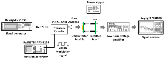 Figure 1 presents a block diagram of the sub-terahertz full-wave imaging system for an object placed on a conveyor belt. The sub-terahertz signals continuously generated from the signal generator pass through an optical system that can irradiate the entire width of the conveyor belt and are evenly incident in the direction perpendicular to the moving direction of the conveyor belt. The signals passing through the object and conveyor belt are transmitted to the detector array mounted inside the conveyor belt. The power level of the transmitted signal depends on the material, uniformity, homogeneity, layer stacks, and other characteristics of the object. The sub-terahertz image can be obtained from the detected output voltages owing to these relative characteristic differences. The transmitting signal is generally fixed at a narrow frequency, and the detectors in the array only collect the signal at the same narrow frequency. A frequency of 0.2 THz is selected in this study for the detection of foreign bodies in food owing to the large difference in the absorption characteristics by water and humidity [23,24,25]. After being amplified and filtered in the signal conditioning block, the outputs of the detector array are reconstructed to the image during signal processing, considering the detector pixel position and the movement of the conveyor belt. The mechanical or electrical modulation technique, which moves the output signal from a direct current (DC) to an arbitrary frequency, can be used in imaging systems to avoid deterioration by the flicker noise of the detector [7].