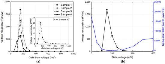 Detection performances of the CMOS detector unit module: (a) Voltage responsivities of four detector unit modules randomly selected in the array. (b) Voltage responsivity and noise-equivalent power of sample 2 among the modules.