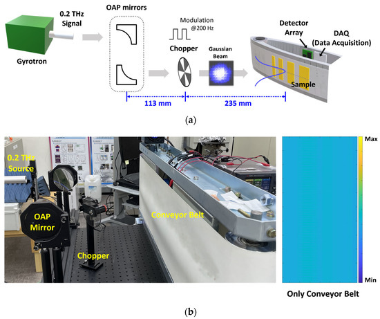 Experimental setup for measuring the sub-terahertz images using the proposed CMOS detector array: (a) Block diagram of the setup. (b) Photo of the setup and the measured image when there is no object on the conveyor belt.