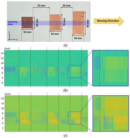 Measured sub-terahertz images: (a) Photo of the target object on the conveyor belt with the physical dimension of the object. (b) Image obtained by using the conventional array with one column consisting of 16 modules. (c) Image obtained by using the proposed array with two columns consisting of 16 × 2 modules.