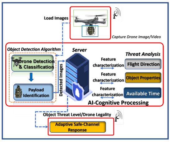 Managing complex and dynamic activities in real-time system designs demands both swiftness and accuracy. AI and system autonomy are inextricably linked. A scenario-based, adaptive-conscious, cognition-friendly AI model is at the heart of a data-centric, hard-based, real-time cyber–physical system. The ALIEN scheme therefore predicates and perpetuates situation-aware safe-channel neutralization, effective detection of variant UAVs, accurate visual identification of conveyed objects, and a timely interception in clusters, as conceptualized in the block diagram in Figure 1 and the system flowchart in Figure 2 respectively.