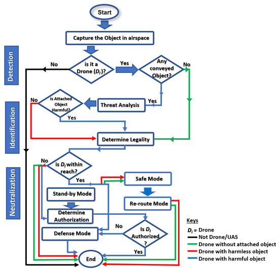 In recent years, unmanned aerial vehicles (UAV) and other intelligent autonomous systems (IAS) have become increasingly common, especially for “priority-based logistics,” which has raised concerns about the reliability of the technologies underpinning these systems and, consequently, the value placed on human lives [5,6]. As a result, if creative, adaptive strategies are not in place to prevent the misuse of UAV technology, an expansion in the intelligence and autonomy of UAVs will jeopardize their future use [7,8]. According to the authors in [9], a drone invasion is a calculated and planned attempt to sabotage operations, confuse workers, destroy installations, and perhaps leak important information. Such invasions are carried out through unauthorized access to restricted areas. According to the United States Federal Aviation Authority (FAA), there were 8344 drone-related violations between 2016 and 2019 [10] despite available counter-invasive technologies. Furthermore, there are already instances of invasions employing quad-copter UAVs (such as the DJI Phantom) for recreational, logistics, and consumer use to destroy industrial sites, transport dangerous goods over borders, and assault important installations [11,12]. Therefore, if sufficient proactive surveillance systems are not in place to confirm a drone’s legitimacy and appropriateness, the sight of a UAV deployed for logistics in a smart city over a drone transportation network (DTN) can overwhelm a civilian area, inflict distress, and cause severe emotional torture. Consequently, this chaotic scenario might endanger the viability of DTS as an intelligent vehicle transportation enabler.