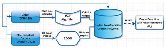 Logic flow of the efficient drone and ranging detector (EDRD) indicating how the drone images from the electro-optical camera and the ranging estimates from the lidar converge for efficient detection estimation and prediction.