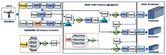 Object detection is carried out on the aerial images acquired by the electro-optical camera using the efficient drone detector network (ALIEN) model. To combine detection performance speed and accuracy in real-time, the ALIEN is an improved version of the DRONET [5] detector model that incorporates strip networks (SPP), focus, path aggregation networks (PANET), and other technologies, as illustrated in Figure 4.