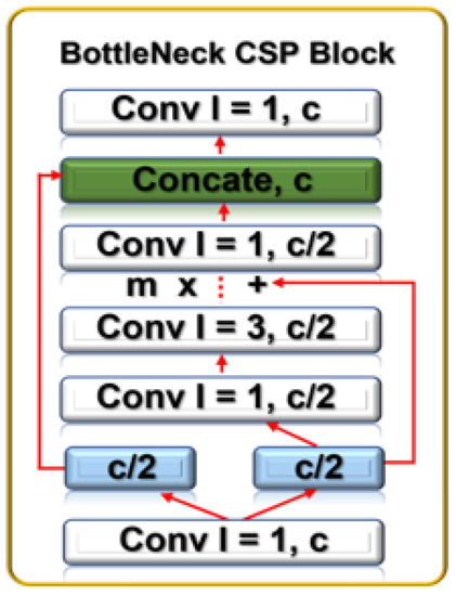The improvement in the detection model is the addition of extra bottleneck CSP layers at the backbone and neck layers, as captured in Table 1. Using a secure networked electro-optical camera, the “Backbone” receives the collected drone image (input), where feature extraction is carried out using a cross-stage partial network (CSP). After entering the “Neck” with PANET and the feature pyramid network (FPN) for feature fusion, the “Head” produces the real detection results, which include the position, score, size, and class. The bottleneck CSP at the backbone layer, combined with SPP and focus, reduces the complexity of large gradient information, truncates the gradient flow of the optimized network, and preserves feature extraction accuracy, as shown in Figure 5.