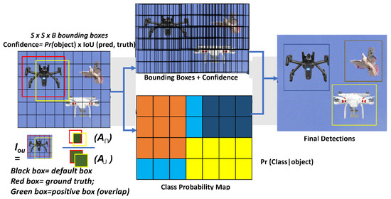 Then, using the formula in Equation (4), the “head” predicts each bounding box region and probability before calculating the overlap known as the intersection of union (IOU).