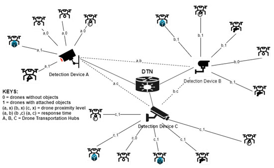 The detection devices (A, B, and C) in the DTN distinguish between different detected aerial objects and choose the best state of each object based on dynamic characteristics. In AL, each cluster for invasive drone encroachment (say, device A) analyzes the drones within its sensing range (a,1; a,1; a,0; a,0; a,0) based on its unique characteristics. Then, with the help of its underlying detection model, it carries out feature extraction and learns from the detected object pattern. Then, the hub shares and communicates the learned or acquired knowledge with other clusters (devices B and C) in the DTN. With subsequent detection and learning, the acquired knowledge from each node is constantly updated in the DTN by the participating nodes/clusters thereby fostering connected intelligence for timely decision making. Therefore, this precise collaborative identification ensures proper and faster eliciting of hostile drones attempting to encroach into the network and differentiates them from hobbyist or logistics drones, thereby gauging their perceived threat in any given setting. To analyze this multivariate attached object recognition and elicitation scenario problem, we use Theorem 2.