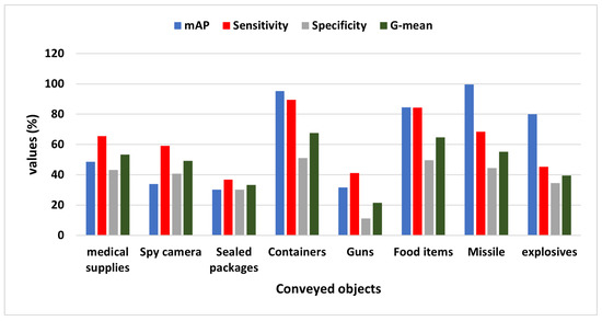 where represents the precision of the model represented as mAP; and is the recall/sensitivity of the model. In ML, is preferred as a better performance evaluation metric than accuracy because an ML model needs to be rational while executing a task to minimize the false prediction or detection rate. The ALIEN model outperformed other YOLO models with F1-scores () of 99.8% for drone detection and 80.1% for conveyed object recognition. This validates that the ALIEN model is more effective than other models for effective counter-invasive encroachment neutralization in a DTN.