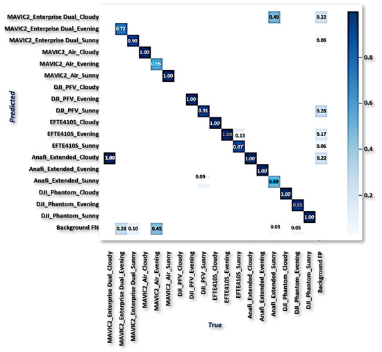 From the result in Table 8, v3 has value, v5s has value, p2 + v5 has value, fpn+v5 has value, etc. However, the ALIEN model achieved a value validating the model with the highest efficiency in handling multi-scale counter-invasive drone with aerial objects encroachment as well as conveyed object recognition prediction under dynamic scenarios. This prediction efficiency is further verified by the confusion matrix in Figure 17 and the detected samples in Figure 13 and Figure 14, with a minimal degree of misclassification.