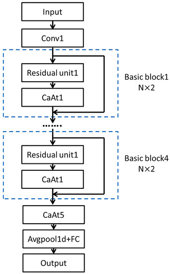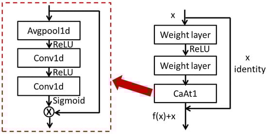 The Basic block consists of a residual block and a channel attention mechanism, as shown in Figure 4. The residual block and channel attention structure in each Basic block are the same, respectively, with different parameters. CaAt1 firstly performs global average pooling on each channel to obtain feature vectors. Secondly, the weight value of the feature vector obtained by the two convolution layers is multiplied by the original feature vector to obtain a new feature vector. The local depth and channel depth feature are extracted by using the advantage of residual connection.