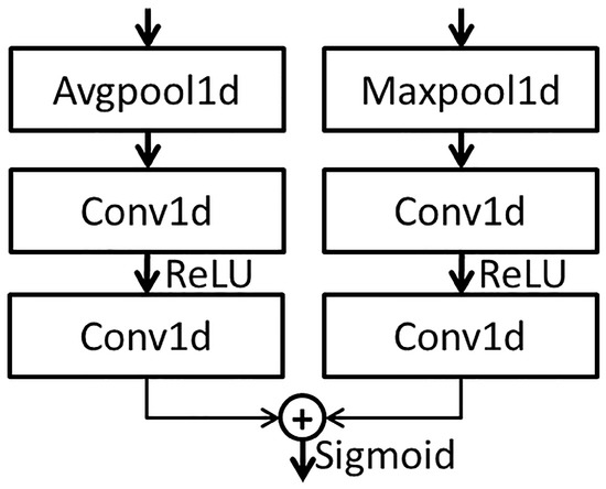 The features extracted from the multi-layer residual network block are input into the CaAt5 structure. The structure diagram of CaAt5 is illustrated in Figure 5. When extracting channel features, not only is average pooling considered, but also maximum pooling is introduced as a supplement. The feature vectors are generated by two pooling functions, respectively, and the new feature vectors are generated by adding the feature vectors after two convolution calculations. Global average pooling has feedback for every pixel on the feature map, while global maximum pooling has feedback of the gradient where the response is the largest in the feature map. Feature calculation is carried out for each pixel on the multi-channel and the one with the largest response in the feature map. This calculation method is more suitable for the adaptive feature extraction of multi-channel time sequence data and automatically learns the importance of features between different channels, as shown in the overall figure in Figure 1.