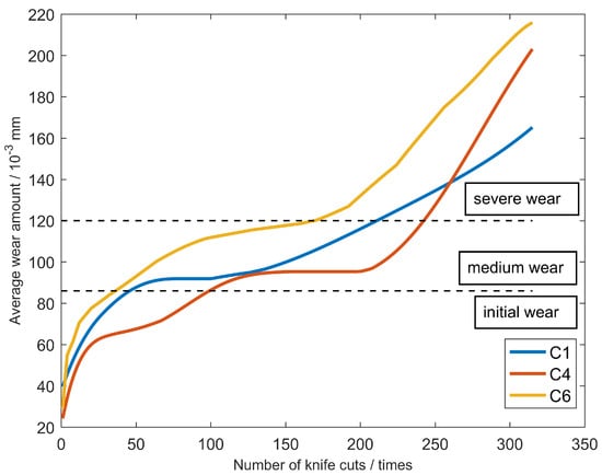 A total of six ball-end carbide milling cutters are recorded as C1, C2, C3, C4, C5 and C6. Only C1, C4 and C6 are used in the model evaluation. The three-way force signal, three-way vibration signal and acoustic emission signal of the tool are, respectively, collected in each process, as shown in Table 3. Considering the convenience of measurement in industrial application, the wear width VB of 1/2 cutting amount on the back tool face is selected as the standard parameter of tool blunting, as shown in Figure 7. For carbide cutting tools, VB above 0.3 mm reaches the standard blunt and the tool must be replaced. The average wear value of the rear tool was calculated as the wear label. Maximum wear of the initial wear stage is 0.086 mm. When the wear amount is greater than 0.12 mm, the tool has reached the stage of severe wear and must be replaced immediately. The middle wear stage is between 0.086 mm and 0.12 mm.The tool wears curves of C1, C4 and C6 are shown in Figure 8.