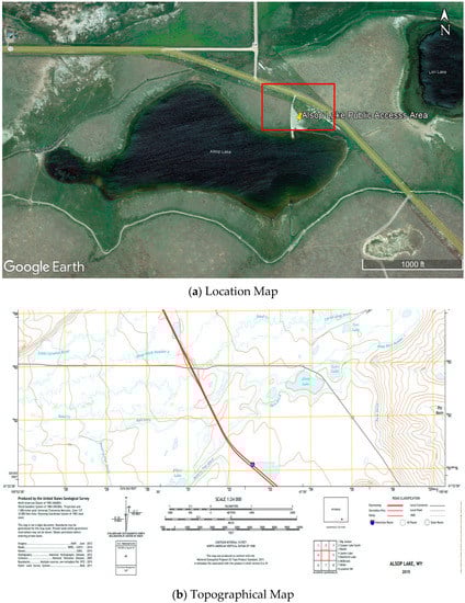 Many factors contribute to the selection of the site location, including accessibility at the site, location, topography, external disturbances, wind, permits, and licenses. The laboratory site selected for the experiment was near Alsop Lake, located in Laramie, Wyoming. The site selection for the experimental study was based on several factors mentioned above. A preliminary site visit was conducted to observe the surroundings, topography, weather, location, and accessibility. The site was a public-access area, free from external disturbances and with no high wind. The test area was a flat surface with no extreme topography. A location image and topography map of the site are shown in Figure 1.