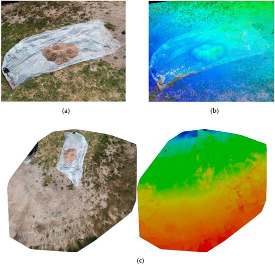 Representation of the generated point cloud model of the laboratory site: (a) Point Cloud Model; (b) Altitude Model; (c) Orthomosaic Model with its corresponding Digital Surface Model (DSM).