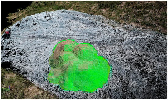 Boundary points were identified in the point cloud model, and the volume was computed as presented in Figure 3. The base limit was set as triangulated, as this option is recommended for stockpiles whose boundary is visible [34].