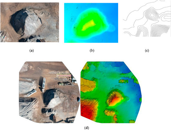 Representation of the generated point cloud model of the quarry site (a) Point Cloud Model; (b) Altitude Model; (c) Contour; (d) Orthomosaic Model with its corresponding Digital Surface Model (DSM).