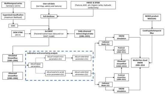 To account for the spatial variability of the catchment, the watershed is divided into subbasins by SWAT, and these are further split into Hydrologic Response Units (HRUs) [35]. The HRUs are characterized by unique soil, land use, and slope combinations. In mountainous basins, where precipitation and temperature have a vital orographic behavior [36,37], SWAT divides HRUs into several bands, depending on the elevations, to extrapolate the meteorological forcing point [38]. Elevation bands in SWAT help to allocate the topographical influences of temperature and precipitation on the simulation of snowmelt/snowpack [11,39]. Two lapse rates, PLAPS and TLAPS, are commonly used to adjust precipitation and temperature in the SWAT model according to elevation [40]. SWAT then incorporates a snow module that uses the temperature index approach (also called the degree-day model) to generate the SWE for each elevation band, defined as the water contents of the snowpack in units of precipitation [41]. The snow temperature index method employed in the SWAT model is associated with numerous parameters, such as snowpack/snowmelt factors (SMFMX, SMFMN), snowfall/snowmelt temperature thresholds (SFTMP, SMTMP), and temperature lag factor (TIMP). However, previous studies using SWAT in mountainous watersheds included snowmelt/accumulation parameters [13,22,42,43,44]. The majority of these research projects allocated a distinct set of snow parameters to an entire basin, even though snow distribution may be very variable in space and time [45,46]. A small number of studies have attempted to assess model performance by taking into account the spatial variability of snow characteristics at various subbasins or elevation bands by using the SWAT model [47]. This research allows SWAT snow parameters to change between subbasins. The efficacy of snow parameter discretization was assessed by comparing spatiotemporal SWAT simulations using the standard lumped approach (S1) and the spatially varied approach (S2). The innovative aspect of this research is the use of remotely sensed snow cover (MODIS-SCA) outputs as an additional restriction to distinguish the differences between the two setups.