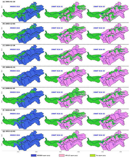 Snow extent visualizations for Oued El Abid catchment from MODIS and SWAT. (a) 16 January 2001, (b) 03 December 2003, (c) 28 December 2004, (d) 31 January 2006, (e) 5 January 2008, (f) 9 January 2010, (g) 2 December 2012.