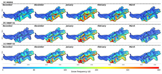 Occurrence frequency of snow during the period between 02/2000 and 12/2014. (a): MODIS, (b): SWAT S1, (c): SWAT S2.