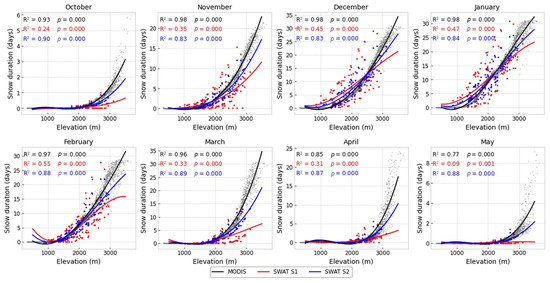The effect of elevation on snow cover during the snowfall season, as it is simulated by the SWAT models and obtained from MODIS, is shown in Figure 6. The illustration represents the curve fittings of snow duration (days) with elevation (m) during the period of 2000–2014. All the fittings in this analysis passed the F-test (p < 0.01). Snow durations from MODIS exhibit a strong relationship with elevation, easily identified by fitting polynomial functions of order 2. There is a clear monthly pattern of snow cover occurrence, where the topographic control of snowfall is shown. However, the relationship between snow duration and elevation is not linear but shows that snow duration begins slowly at lower elevations and rapidly speeds up when elevation is above 1500 m. As stated by [7], the majority of the snowfall in the Oum Er-Rbia basin, even at its peak, is localized above 2500 m. Ref. [6,84,85] reported similar findings, demonstrating that snow variation in the High Atlas is largely dependent on elevation. Generally, SWAT models and MODIS are in agreement about the distribution of order between months, as both datasets show more snow in January, followed by December and February with similar distribution. Despite that, results illustrate remarkable differences in the shape of the elevation–snow duration relationships between SWAT and MODIS, particularly in October, March, April, and May. Model S1 demonstrated a poor correlation in accumulation and ablation months. Model S1 predicts more snow days in low-lying areas and fewer at higher elevations from November to February. This might be caused by the lumped approach used in this model, which suggests using a unique set of parameters that control snowfall and snowmelt processes. S1 tends to underestimate average snow duration in most cases. In contrast, the S2 model retains greater relationships between elevation and average snow duration throughout all months studied. However, the S2 model corrected snow duration at low and high elevations, demonstrating good improvements.