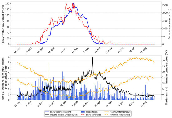 The catchment of Oued El Abid is characterized by snowfall precipitation, since the highest points are located at altitudes exceeding 3000 m (Figure 1). Therefore, a great part of its area is often covered with a snowpack that persists until the end of the spring season [50]. Snowfall contributes to between 20 and 80 percent of total precipitation reported on the southern and northern parts of the High Atlas in winter, according to [51]. Later in springtime, snowmelt fills the reservoir of Bine El Ouidane after the rainy season, allowing for continuous irrigation and water consumption until the end of the growing season in May. This means that this dam plays a key role in the freshwater supply for irrigation, hydropower production, and drinking water for the people living in the central High Atlas.