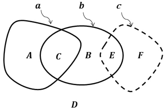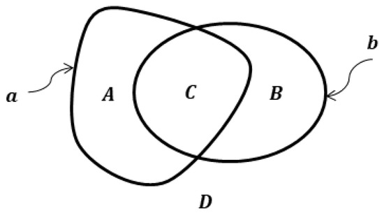 Necessity. As can be seen from the diagram in Figure 2, the condition of equality of figures and is equivalent to the equality of both their intersection parts and to the zero figure . Let us suppose there is a figure that has different ER with and , i.e., different connection values with these figures. For example, , (Figure 2). Then . Therefore, , which proves the necessity condition.