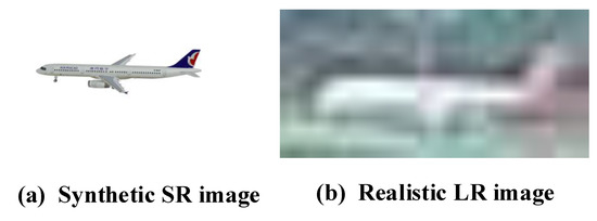 The majority of the current methods [10,11,12] focus on studying how to precisely estimate the aircraft pose from high-resolution (HR) aircraft images (e.g., or ). Since their synthetic datasets cannot completely simulate realistic and complicated airport field environments, there are massive gaps in the study on estimating aircraft pose in low-resolution (LR) situations (e.g., ), as shown in Figure 1a. Although high-resolution images can provide more details, in real airport scenes, such as long-distance capture, most aircraft images can only be acquired as poor-quality LR images, as shown in Figure 1b. Therefore, it is necessary to use super-resolution methods to help aircraft pose estimation.