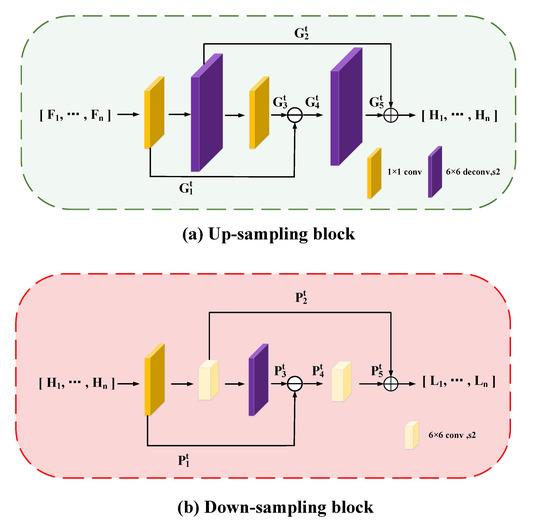 is the feature map of the final scale-up of the upsampling block, and is the feature tensor of the first scale-up at stage t. As shown in Equation (4), a scale-down is carried out in between the two scale-ups, and the reconstructed residuals are propagated forward and self-corrected backward: