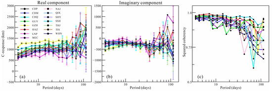 C-responses and their squared coherency at the 15 selected observatories. The lines in (a,b) are the real and imaginary components of the C-responses, and vertical lines are the data errors. (c) The variations in the squared coherency of C-responses.