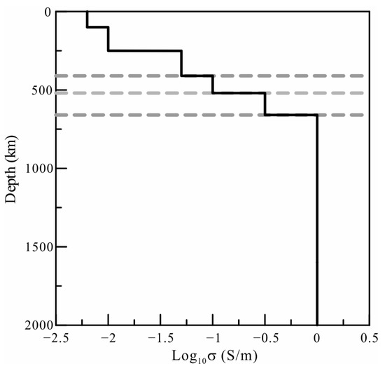 where is the reciprocal of electrical conductivity , is the vacuum magnetic permeability, and is the imaginary unit. Equation (2) can be solved by means of the staggered-grid finite difference method in a spherical coordinate system [20]. The model parameterized for calculation includes resistive air and conductive Earth. The outer boundary of air is 2 from the surface, and its resistivity is set to a moderately large finite value of 1010 Ω·m. The inner boundary of Earth is the core–mantle boundary (CMB) due to the superconductive core [17]. The tangential components of H at the boundaries are specified so that Equation (2) holds throughout the space domain, while the resultant numerical system remains acceptably well-conditioned. The location of the source is placed at a radial distance from Earth’s surface of 10 to ensure that the secondary magnetic field induced by the conductive Earth can be considered negligible. A variant of the biconjugate gradient and an iteration method are used to obtain the solution of discretized Equation (2) [21]. To ensure that H is conservative during iteration, the divergence correction [22] is also applied.