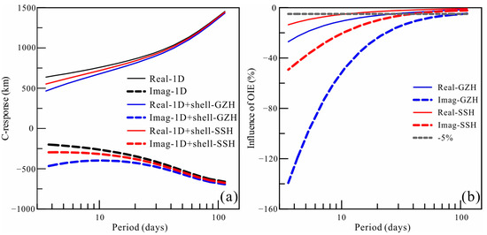 The C-responses at coastal observatories are significantly influenced by ocean induction effects (OIEs) due to the large contrast in conductivity between oceans and continents, especially for responses over short periods [27,28,29,30]. Some of our selected observatories are located near the coastline, so we examine the OIEs on C-responses. Based on the global average one-dimensional (1D) model (Figure 3) derived from vector magnetic field data observed by satellite [31], we calculated the C-response at the Guangzhou (GZH) and Sheshan (SSH) stations near the coastline. The C-responses of the 1D model covered by a shell comprising oceans and continents at the two stations were also calculated. As shown in Figure 4, both the real and imaginary components of the C-response are significantly affected in the examined periods. The influence on the imaginary components is more obvious, and the OIEs are stronger in GZH than in SSH. The influence of the OIEs at the two stations can reach a period of 30 days if 5% variations are taken as a reference, which are commonly used as an error floor in electromagnetic induction inversion [32,33,34]. According to the relationship between electrical conductivity and the C-response, the conductivity is proportional to the imaginary component of the C-response, and the penetration depth is directly proportional to the real component. The strong variations in C-responses correspond to the extremely enhanced conductivity in the shallow mantle, which do not coincide with the actual situation. Therefore, the response of stations affected by OIEs must be corrected.