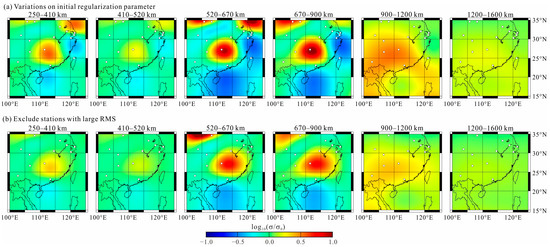 The results of inversions with an initial regularization parameter equaling 100 (a) and stations excluding responses with a large RMS (b).
