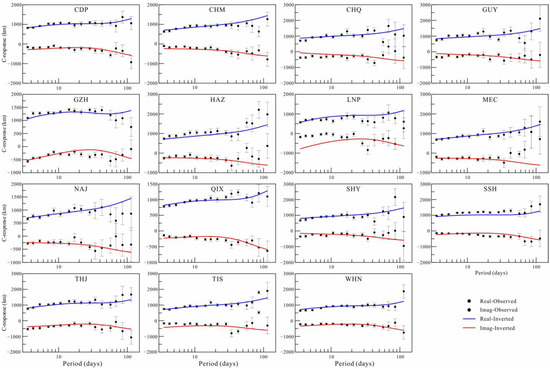 Hourly mean value time series of the three components of the geomagnetic field can be obtained from the World Data Center. In this paper, the selected time series are from 6 years up to approximately 60 years. In addition, the Geomagnetic Network of China provides data from deployed geomagnetic stations in China, which significantly enhances the number of stations that can be used in GDS inversion. After careful selection according to the duration and noise that we presented previously [21], we obtained 15 geomagnetic observatories in South China for further consideration (Figure 1). The details of the observatories are listed in Table 1. The estimated C-responses and their errors within 16 periods from 3.5 to 113 days at the selected stations are presented in Figure 2. The estimation of C-responses in the frequency domain strongly depends on the data length in the time domain. However, the data length varies at different stations, besides the observed data being strongly affected by environmental noise and the ocean effect, leading to a huge variability both in the real and imaginary parts of C-responses, especially for responses in a long period. The variation in responses at different stations indicates that the electrical structure beneath South China is heterogeneous. The squared coherency of C-responses, which is commonly treated as a quality indicator of C-responses, is depicted in Figure 2c, showing that most of the C-responses are of good quality, while some stations produce C-responses of poor quality. Considering the strong fluctuation for some stations, the L1-norm measurement is used to measure the data misfit to suppress the influence of data noise on the inversion results [21].