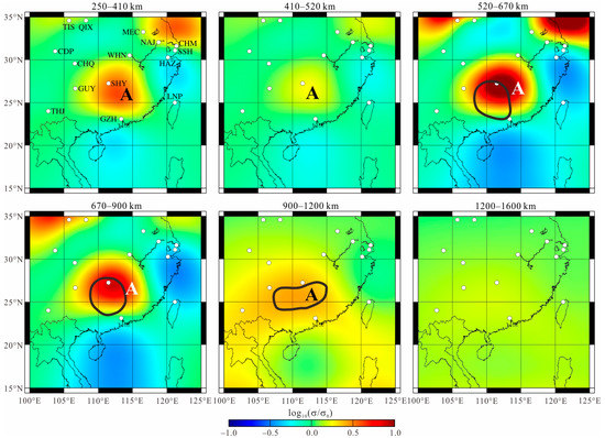 Electrical conductivity model of the mantle beneath South China. Label A represents the high conductivity zone named anomaly A. The black lines are the low-velocity zones observed via the teleseismic imaging of Xia et al. [10].