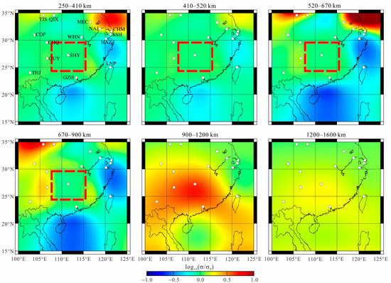 Our deduction is also supported by previous seismological images. Xia et al. [10] discovered a continuous low-velocity anomaly in and around the MTZ, which extends down to the lower mantle deeper than 1100 km, as marked by the black circles in Figure 7. Considering that the electrical structure not covered by geomagnetic stations cannot be well constrained by GDS, we only show the seismic structure in the region covered by our selected stations. The low-velocity anomaly is suggested to be the tail and head of the Hainan plume, which originates in the lower mantle and feeds the Hainan hotspot. Other wave velocity structures [48,49,50] and perturbations of 410 km and 660 km discontinuity [41] also suggest the existence of the Hainan plume. The high temperature associated with the Hainan plume can concurrently decrease the seismic velocity and increase the electrical conductivity significantly [3].