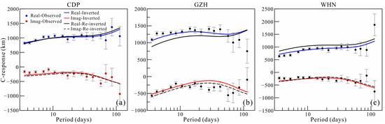 Fitness curves of the response of inversion results, re-inverted results, and the observed C-responses for three geomagnetic observatories (CDP (a), GZH (b), and WHN (c)) distributed around Anomaly A.