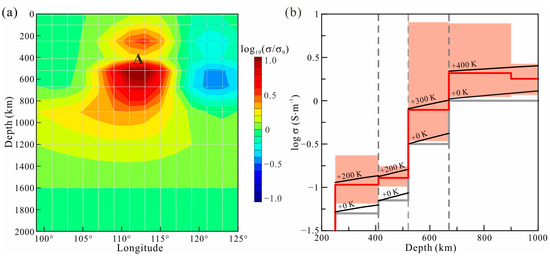 where is the electrical conductivity of the lower mantle, is the pre-exponential factor, and k is the Boltzmann constant. P and T are the pressure and temperature, and their values at different depths in the mantle can be extracted from Xu et al. [43]. and are the activation energy and activation volume, respectively. Taken from the literature [43], , , and In the uppermost lower mantle, the average temperature is approximately 1900 K, which can be calculated from the global average conductivity according to Equation (12) and matches the result presented by Xu et al. [43]. To fit the average conductivity of Anomaly A, a temperature at approximately 2300 K, which is 400 K higher than the global average, is required (Figure 11b). Additionally, the temperature at the CMB is approximately 2550 K; assuming an adiabatic upwelling mantle plume originating from the CMB, this estimate is reasonable.
